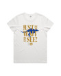 Colour/s: Crisp White Tee with bold Navy and Gold print